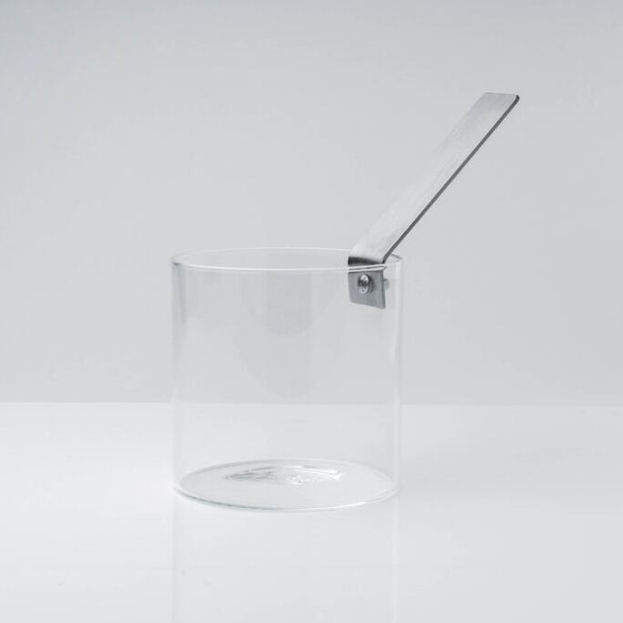 THE GLASS POTからインスピレーションを得た、硼珪酸ガラス製の透明なミルクパン「The Kettle」は、スチールのハンドルが特徴です。ララ・カッフィのデザインによるミルクパンは、有名なポットのミニチュア版で、紛れもない同じスタイルを再現しています。